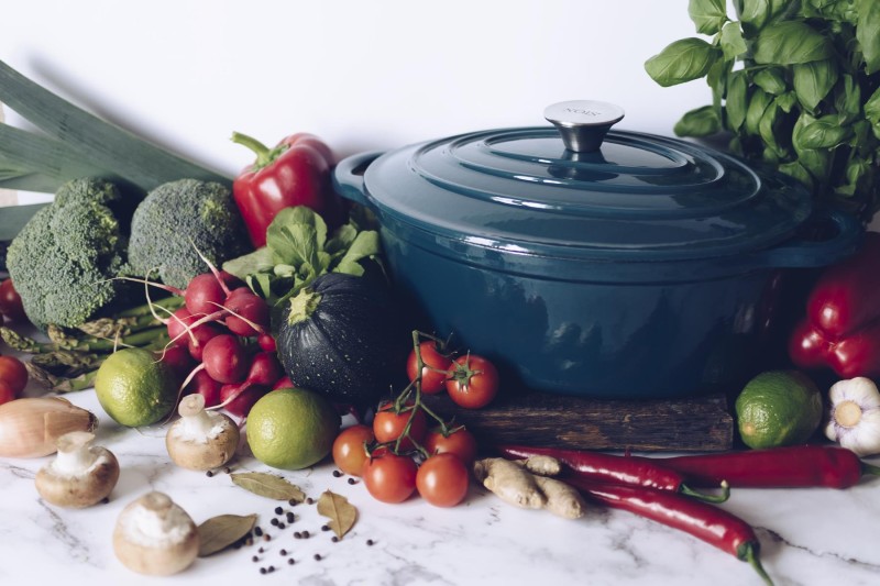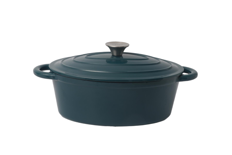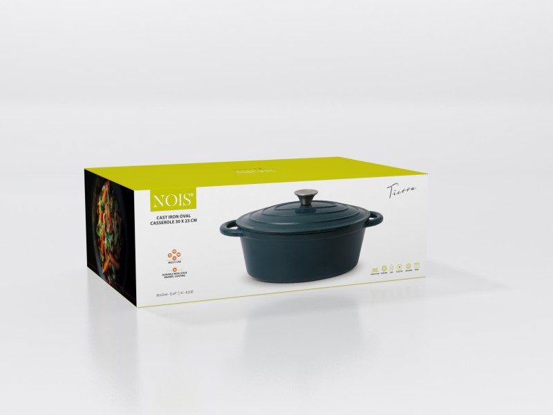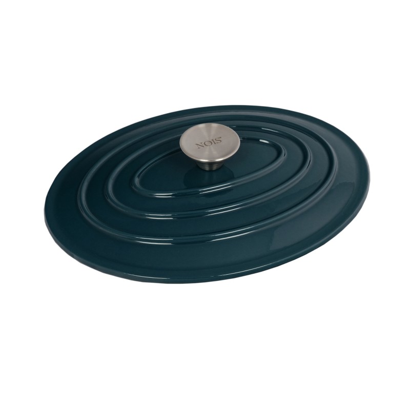 Garnek owalny NOIS 30 cm morski wykonany jest z żeliwa, z zewnątrz i wewnątrz pokryty podwójną warstwą emalii przyjazną dla środowiska i odporną na wysokie temperatury. Emaliowane żeliwo spełnia wszystkie wymagania stawiane współcześnie naczyniom w zakresie przygotowywania i przechowywania żywności. Przy odpowiednim użytkowaniu przyrządzane w nich potrawy zachowują witaminy i składniki odżywcze. Masywna i szczelnie przylegająca pokrywa o specjalnej konstrukcji utrzymuje parę w naczyniu i zapewnia optymalne gotowanie. Para wodna skrapla się na wypustkach znajdujących się na wewnętrznej stronie pokrywy, a kapiąca woda równomiernie spływa na powierzchnię potraw, dzięki czemu są one soczyste i smaczne. Wszystkie części żeliwnego naczynia (dno, ścianki, pokrywa) równie długo utrzymują ciepło. Daje to pewność, że po nakryciu stołu potrawy długo pozostaną gorące. Emaliowana powierzchnia jest łatwa w utrzymaniu i czyszczeniu oraz ma estetyczny wygląd. W przeciwieństwie do tradycyjnych naczyń, w prezentowanych można przez długi czas przechowywać wcześniej przygotowane potrawy.